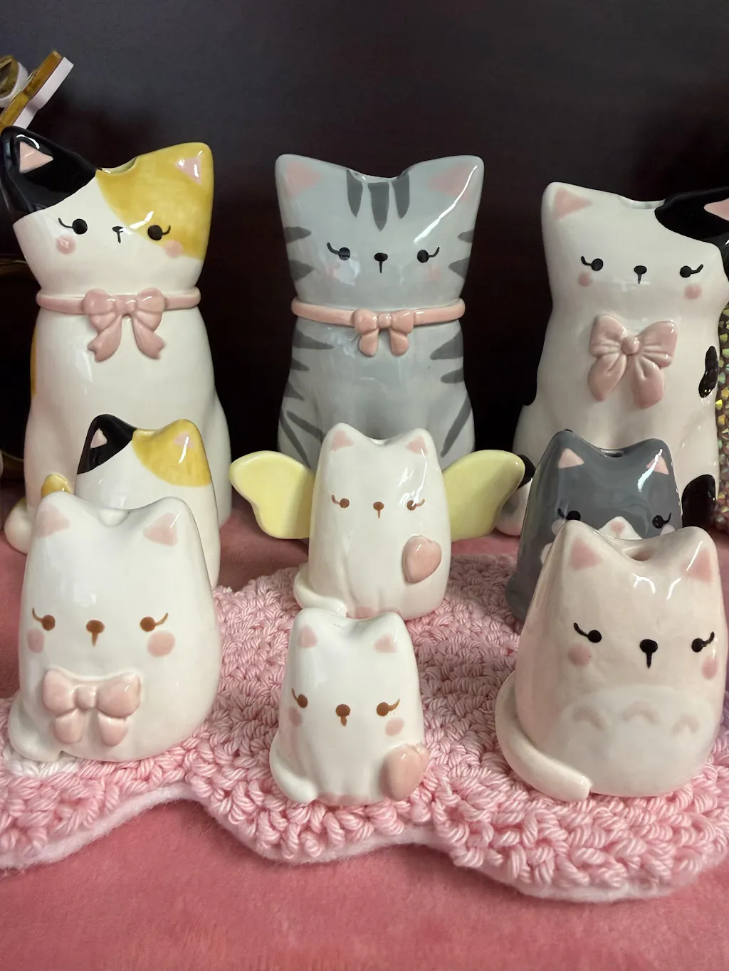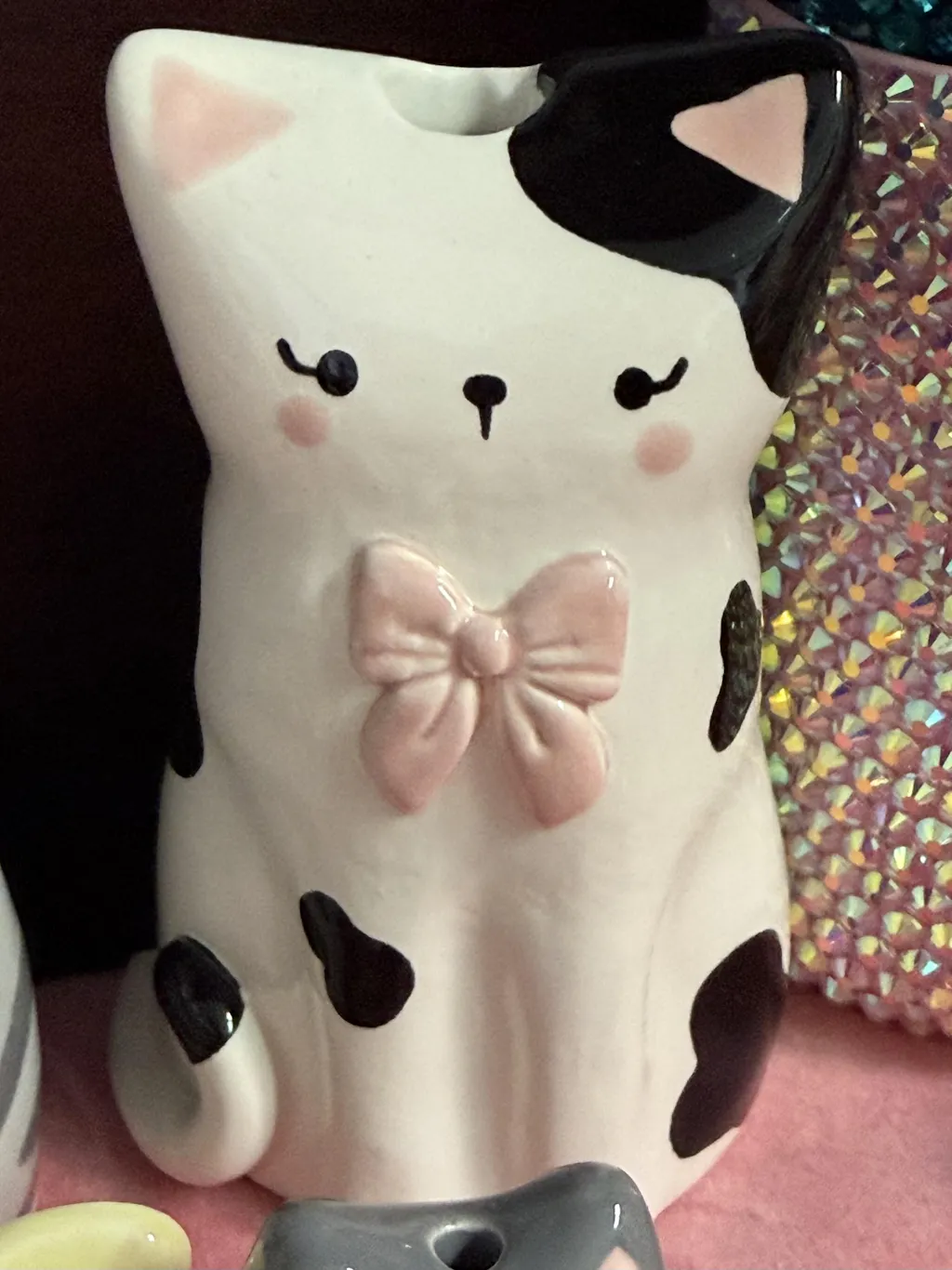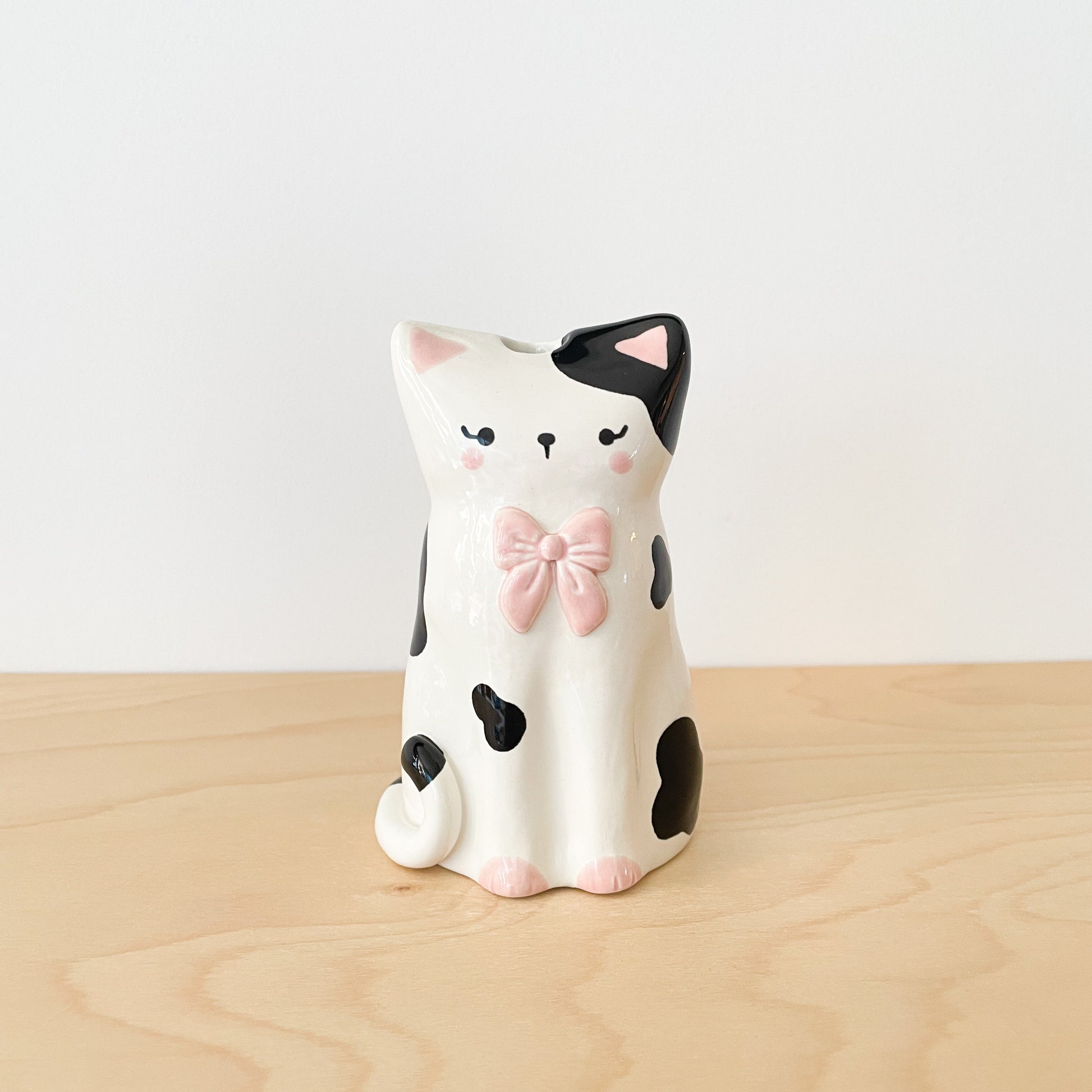 Say hello to this delightfully quirky black spotty cat vase! Hand-sculpted and hand-painted with charming details, this feline friend features adorable pink paws and a fabulous oversized pink bow that steals the show.