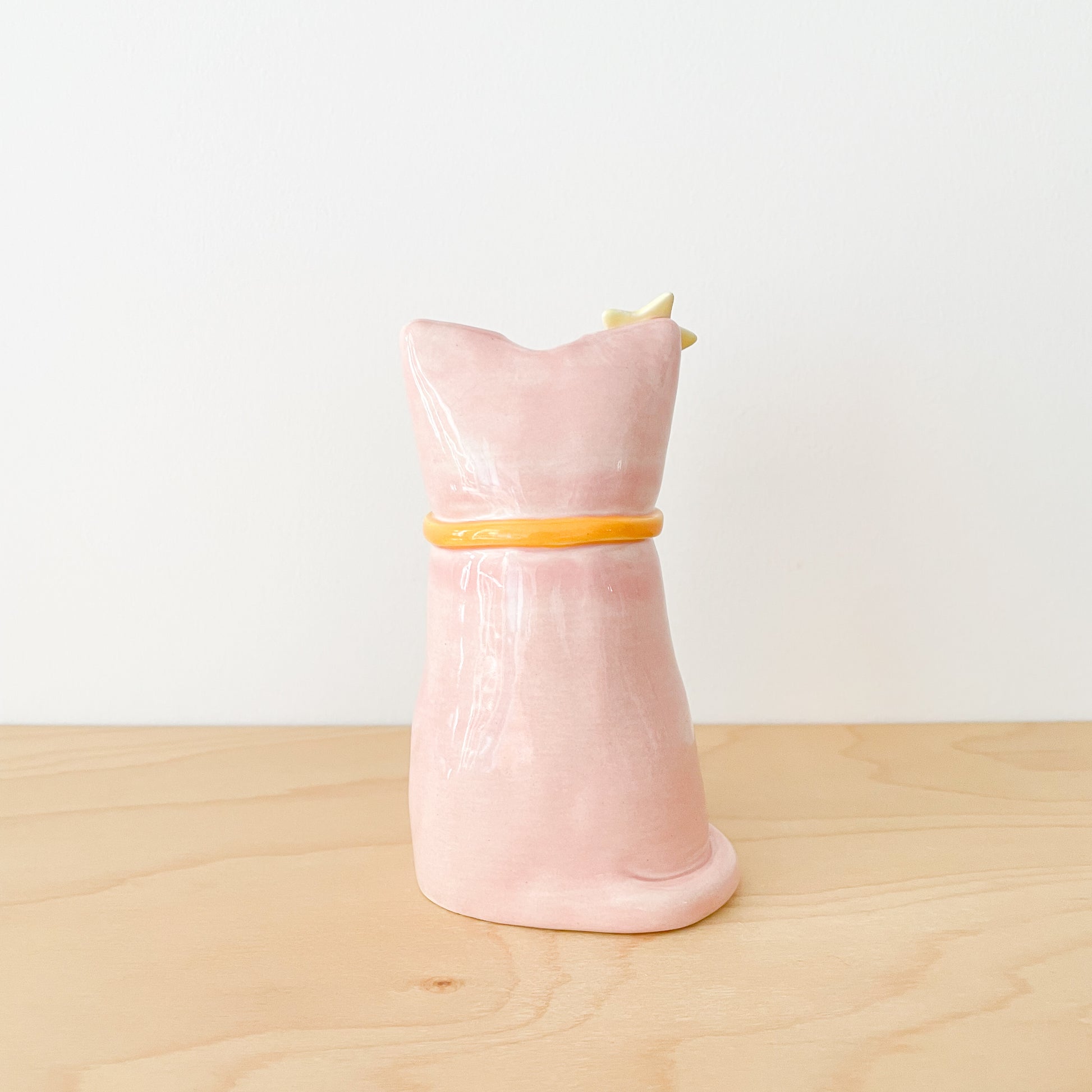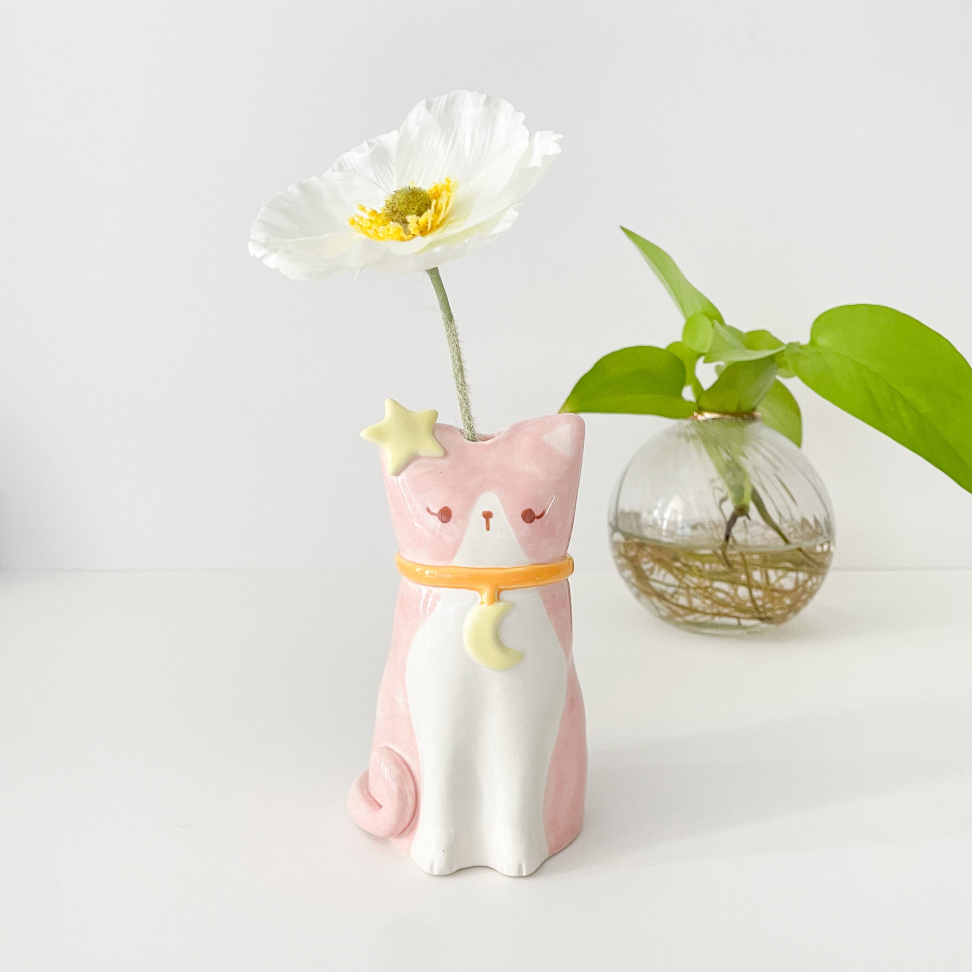 A dapper chonky pink tuxedo cat vase, hand sculpted and hand painted with style. This plump feline friend works beautifully as a flower vessel or standalone decoration for any cat lover's space.