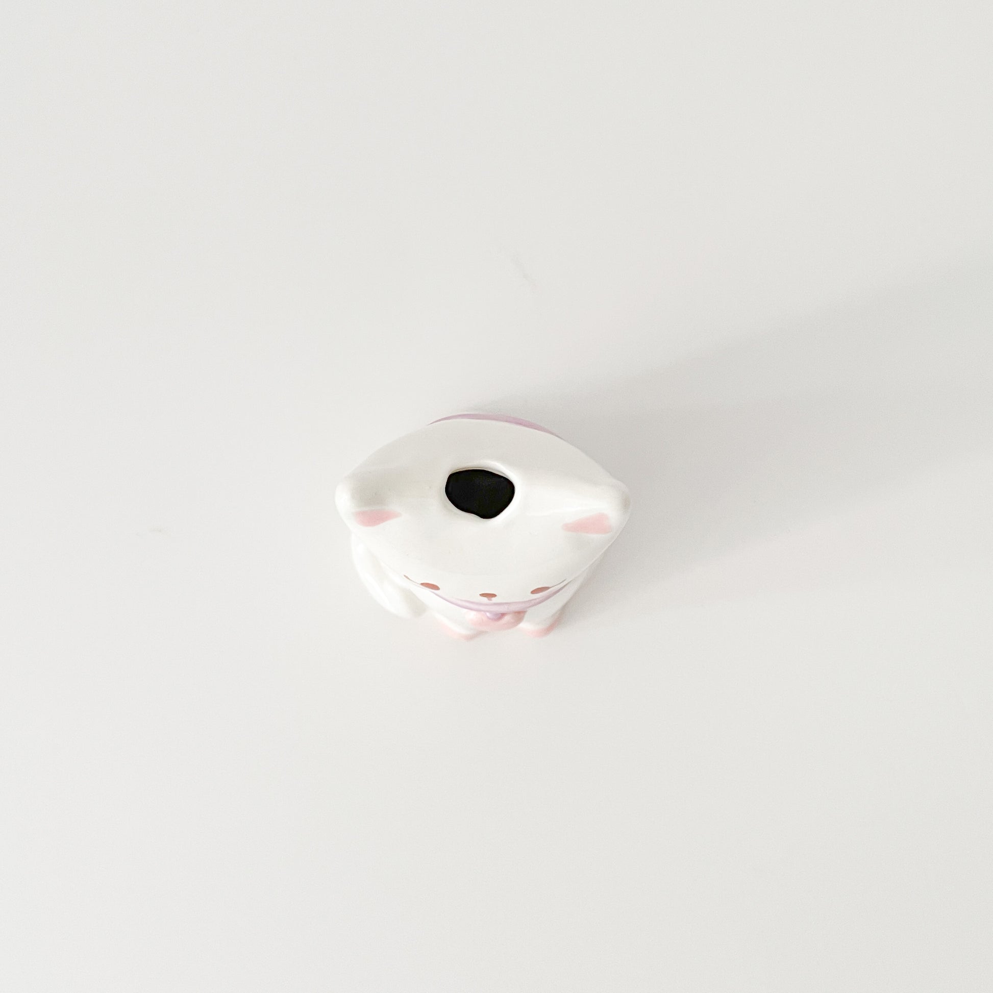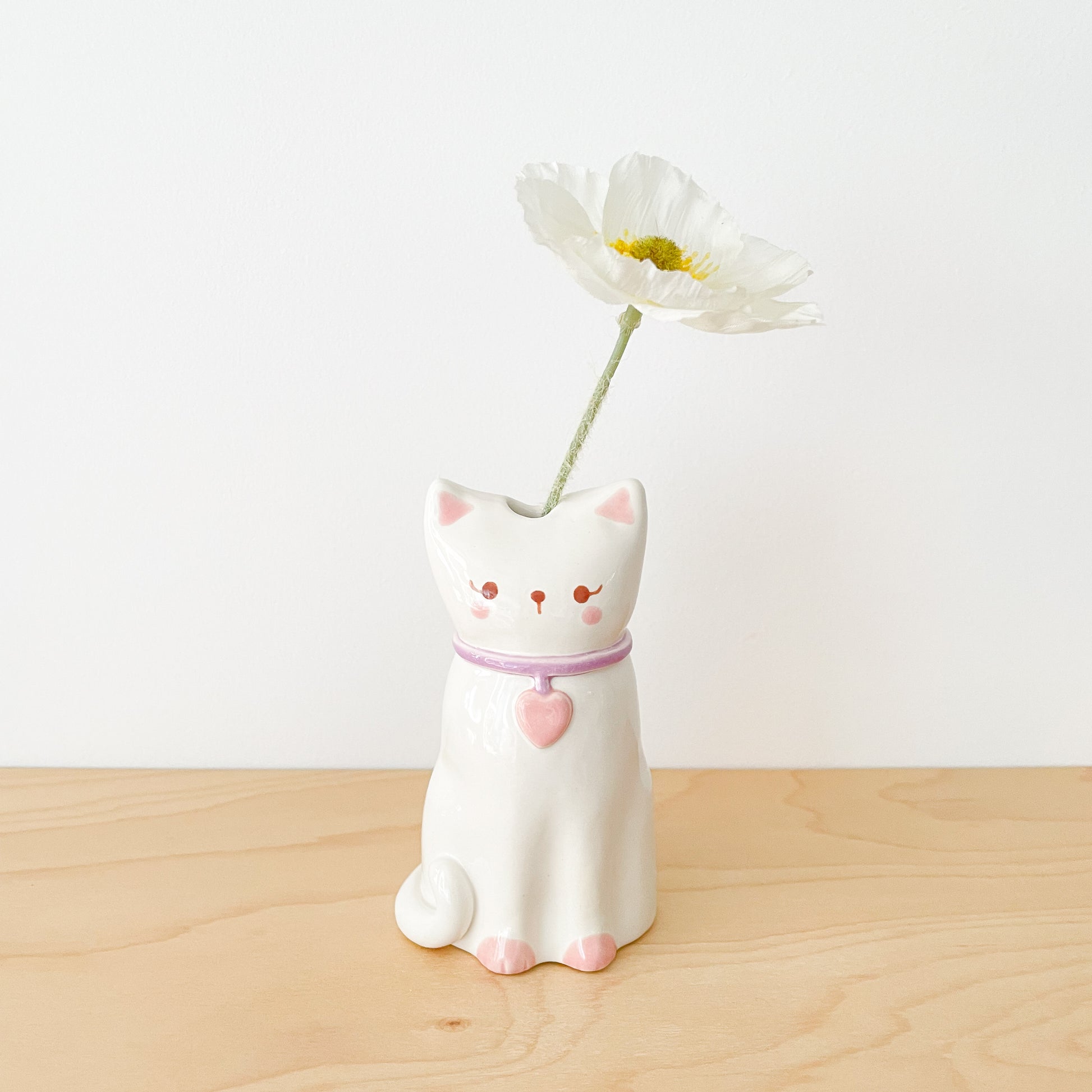 A sweet white cat vase with a purple collar and pink heart charm, hand painted and hand sculpted with care. This charming kitty is ideal for flowers or displaying solo, bringing love and personality to any cat lover's collection.