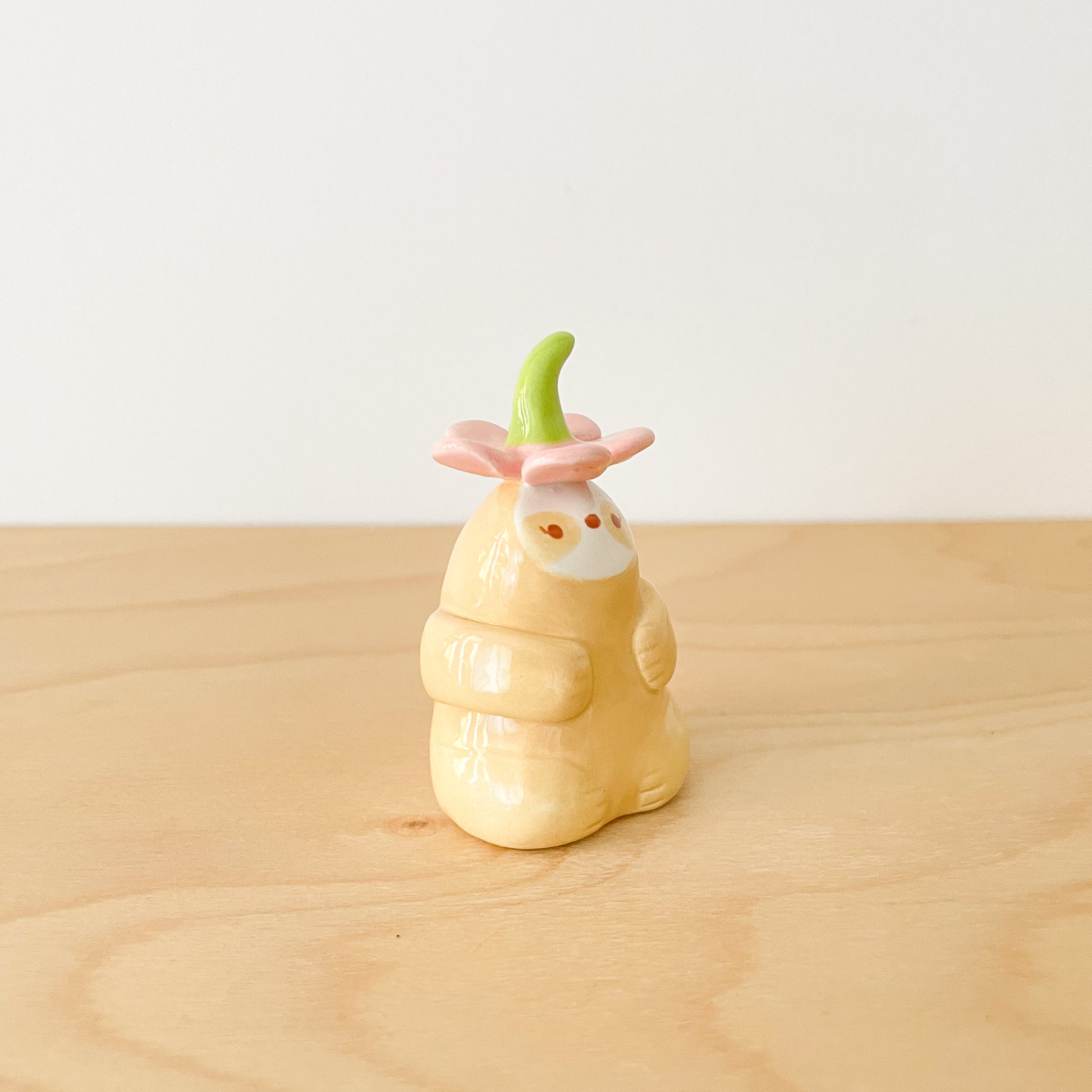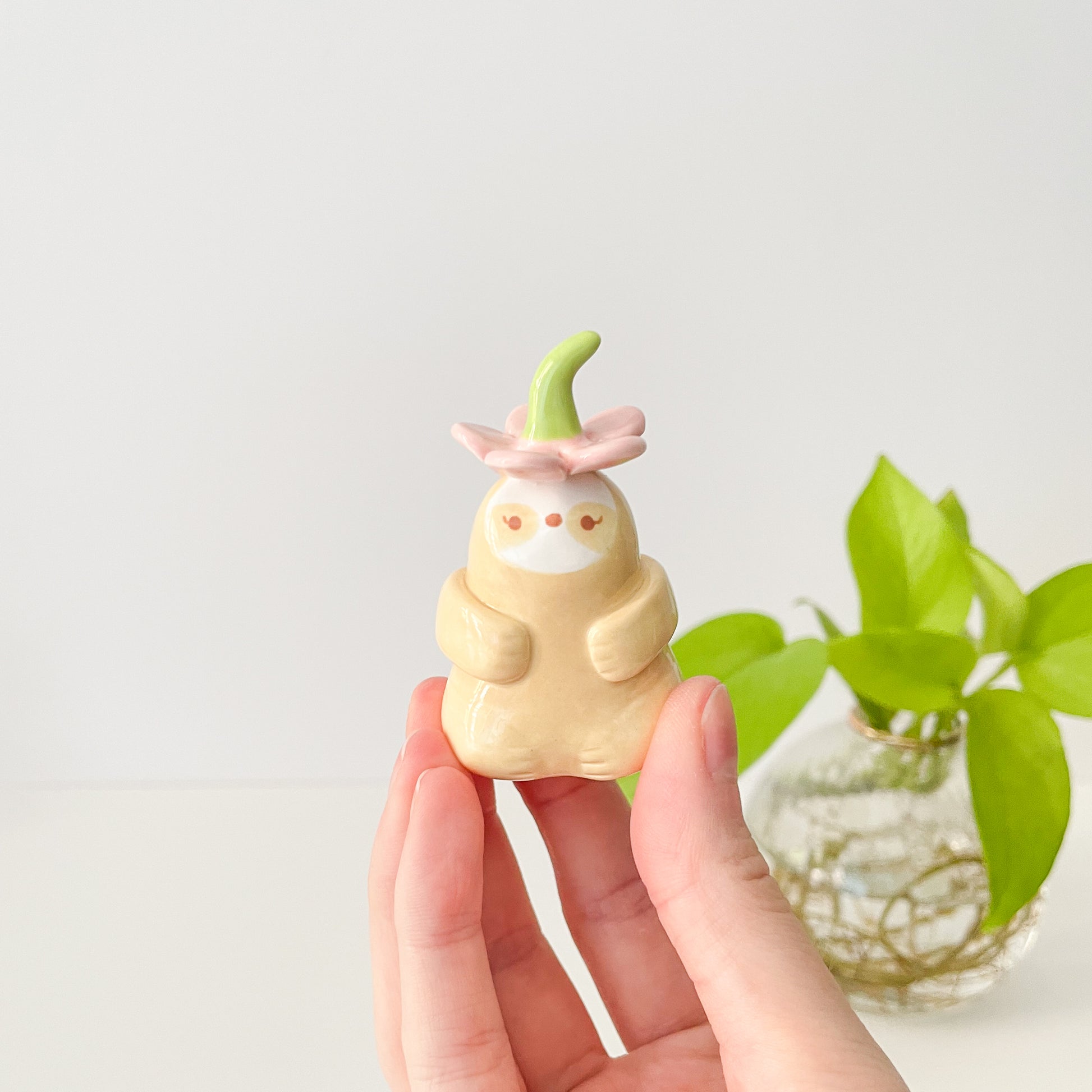 Adorable brown sloth with a pink flower hat that stores your rings. A cute and quirky addition to any space!