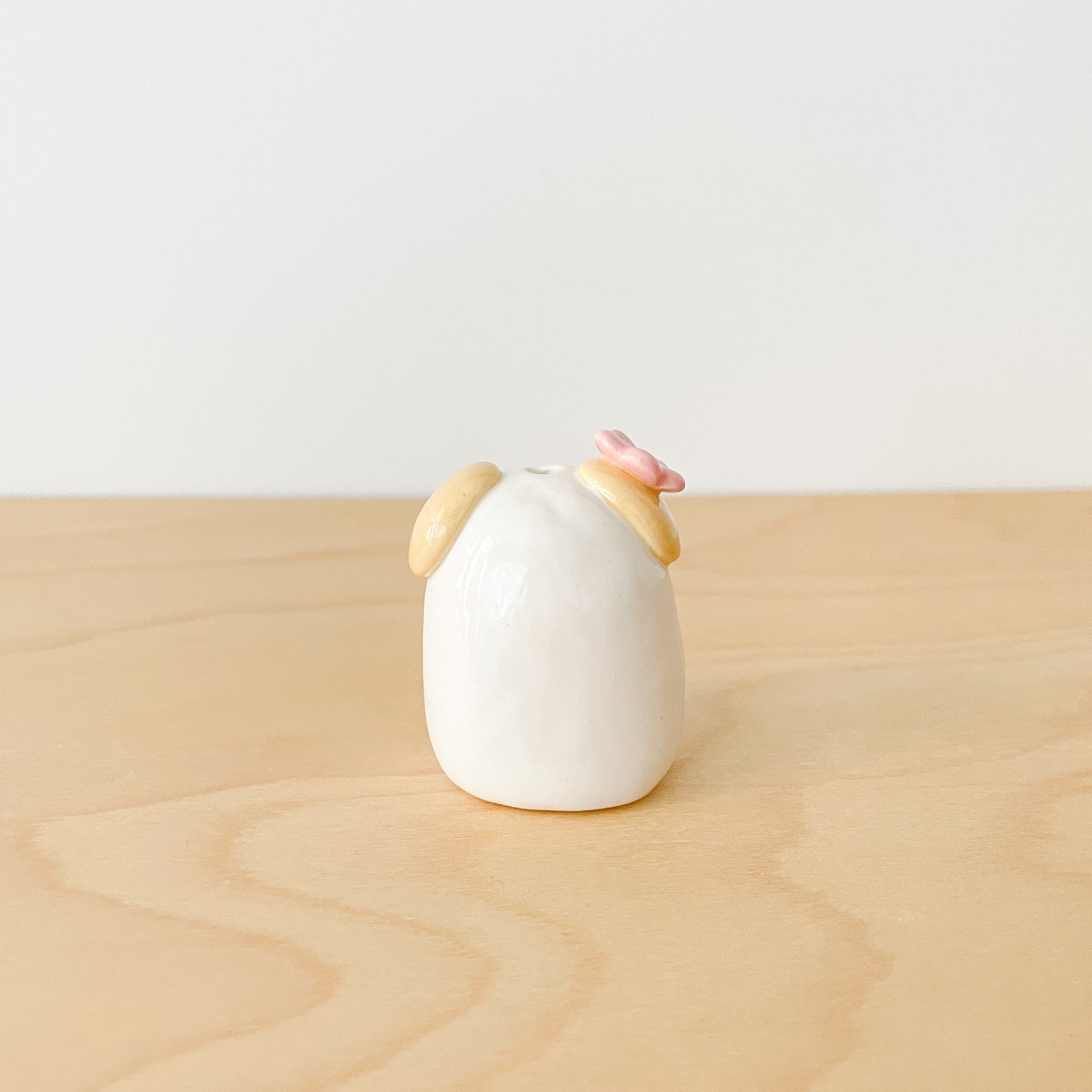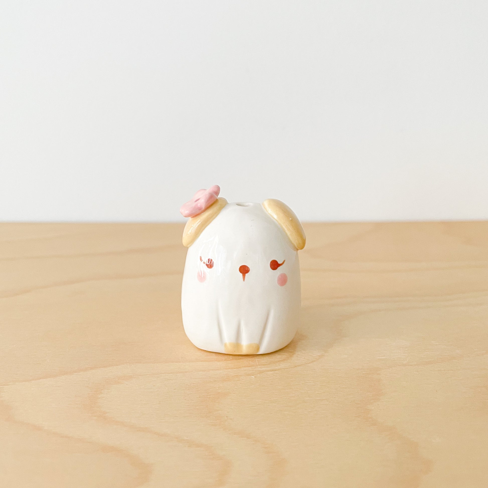 A sweet dog mini vase with a pink flower. Perfect for single stems and adding charm to any space!