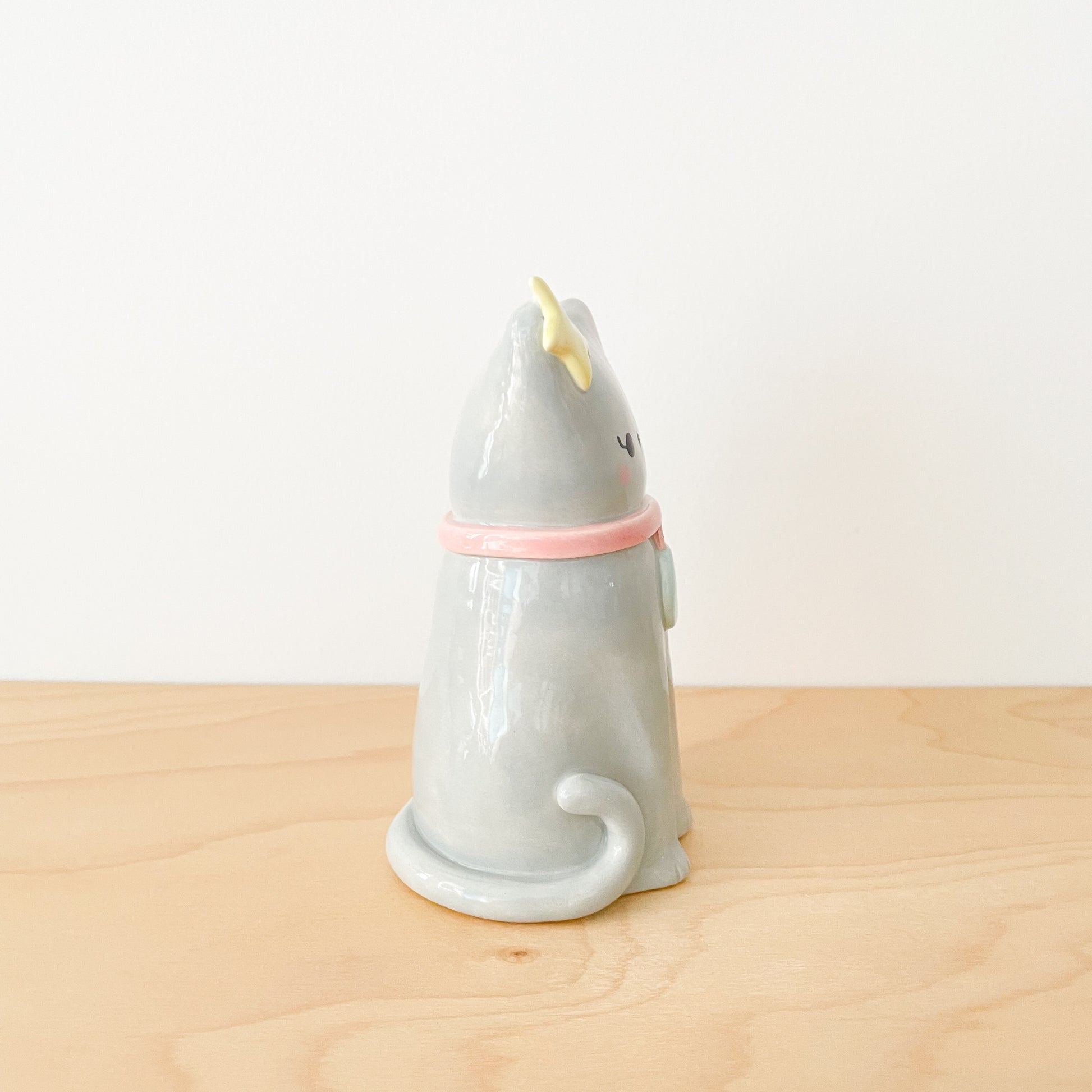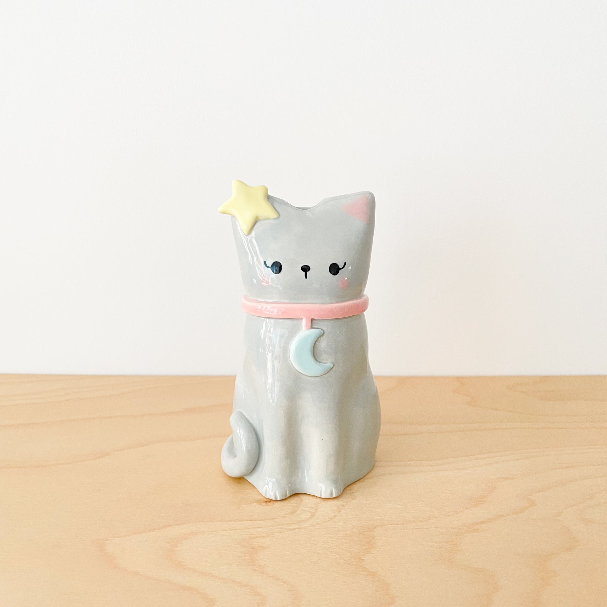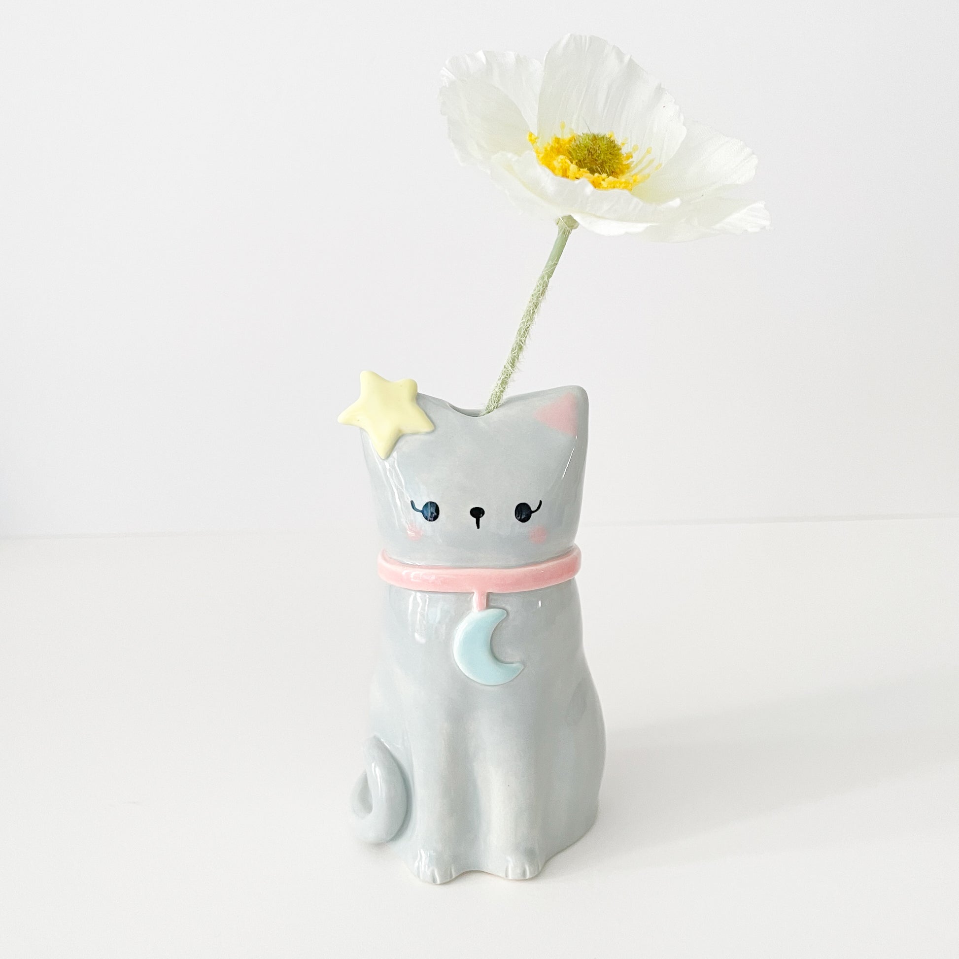 A dreamy grey cat vase with celestial flair, featuring a star on its ear and moon collar. Hand sculpted and hand painted, this magical kitty is perfect for flowers or as a standalone decoration that brings a touch of cosmic charm to your space.