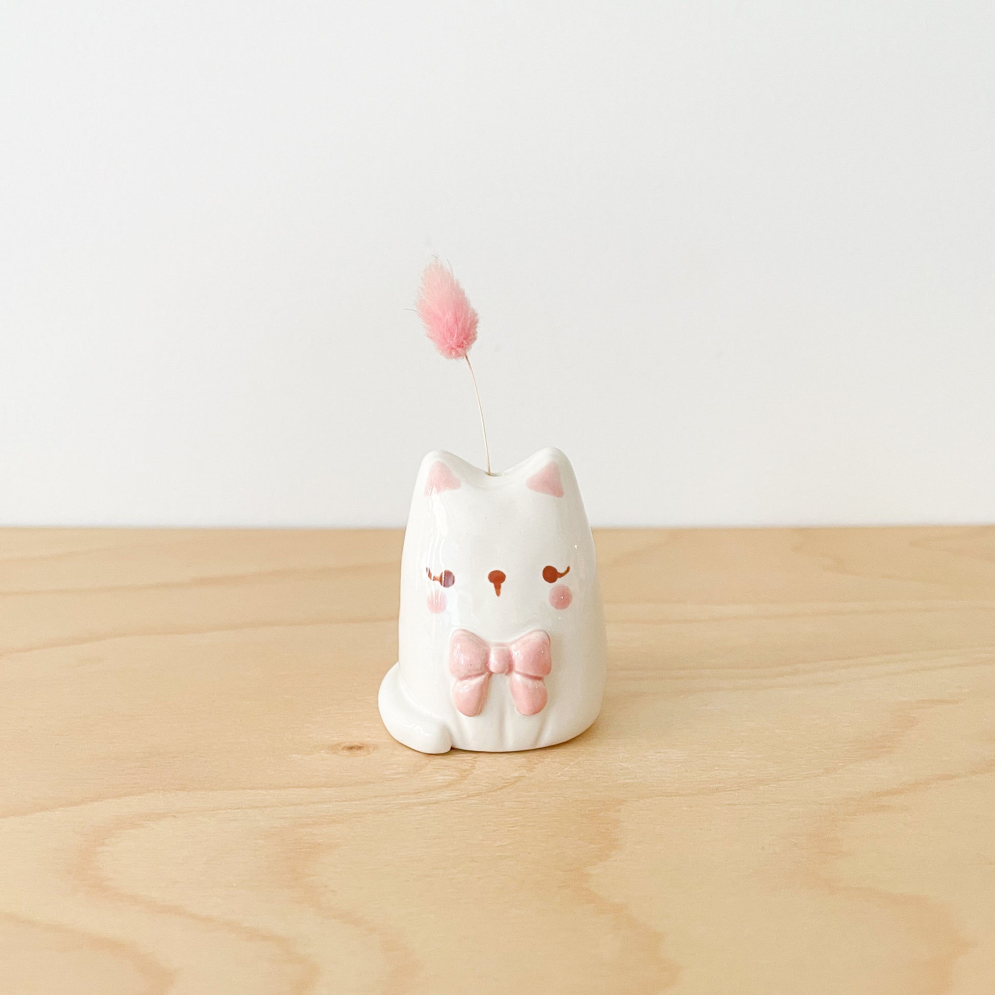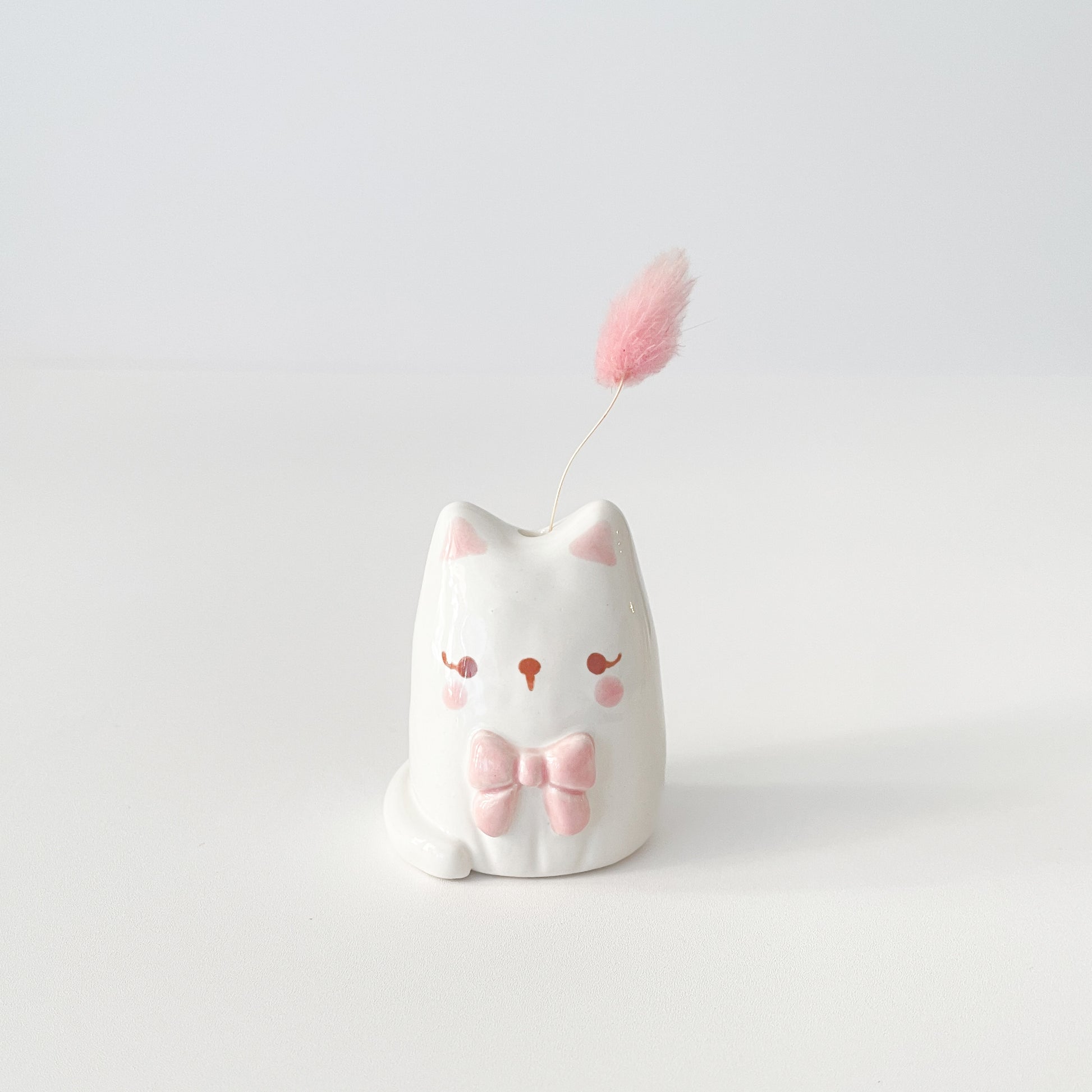Adorable feline charm meets functional florals! This delightful mini vase features a sweet white cat wearing a precious pink bow, perfect for displaying a dried flowers or your cat whiskers.