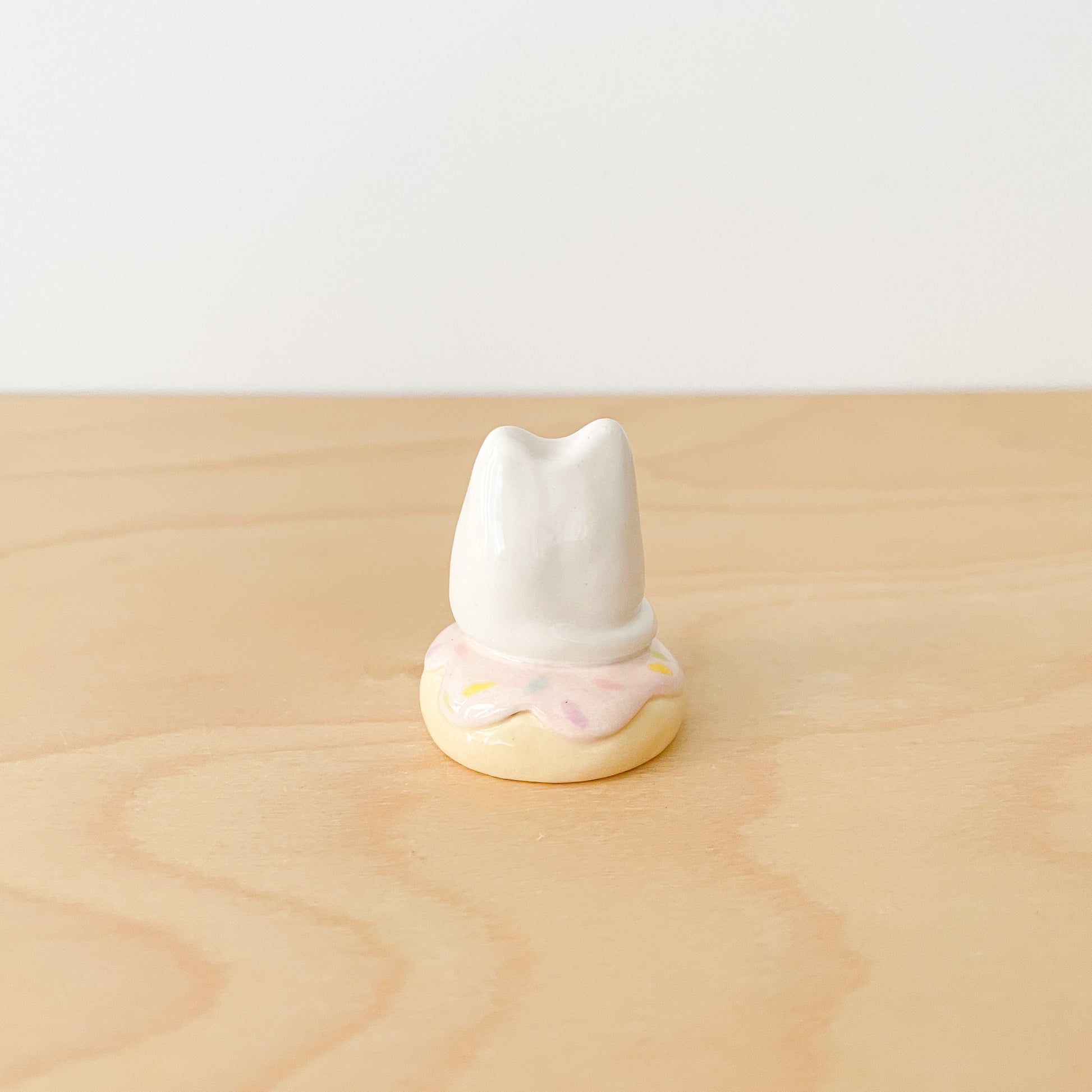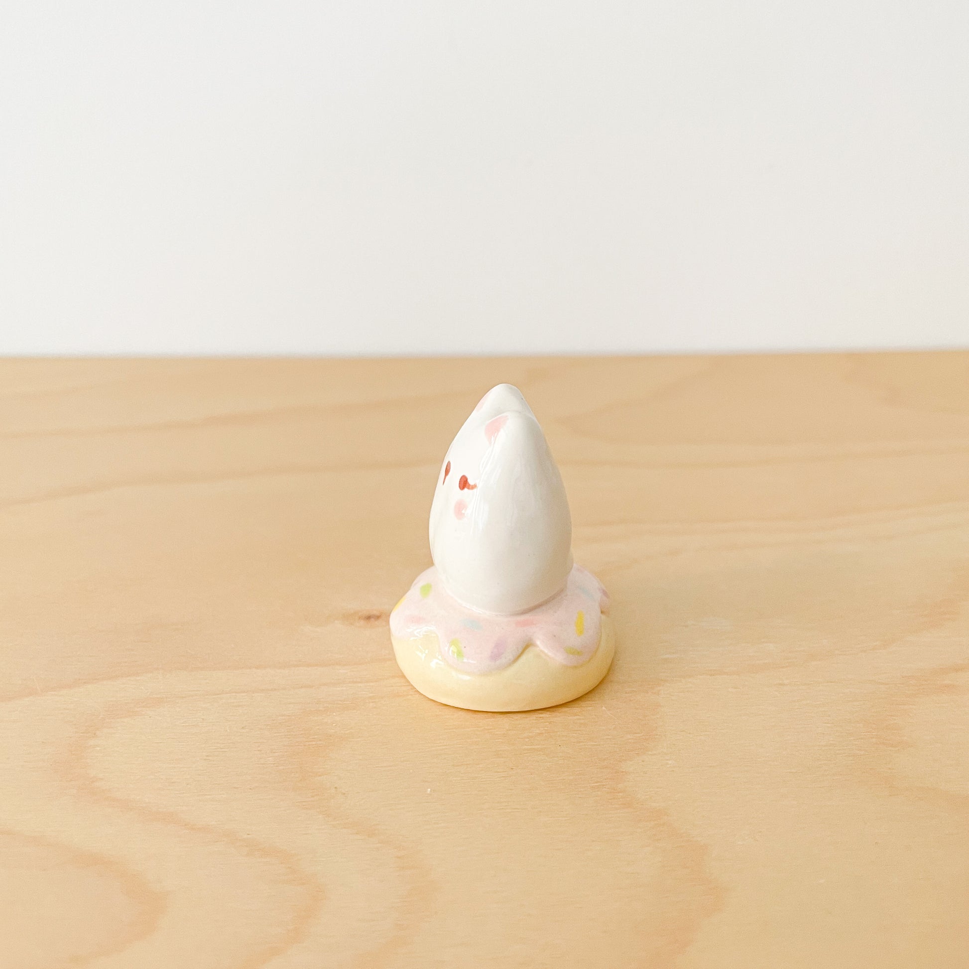 A cute white cat sitting on a strawberry donut with rainbow sprinkles. The perfect playful desk pal to brighten your workspace!