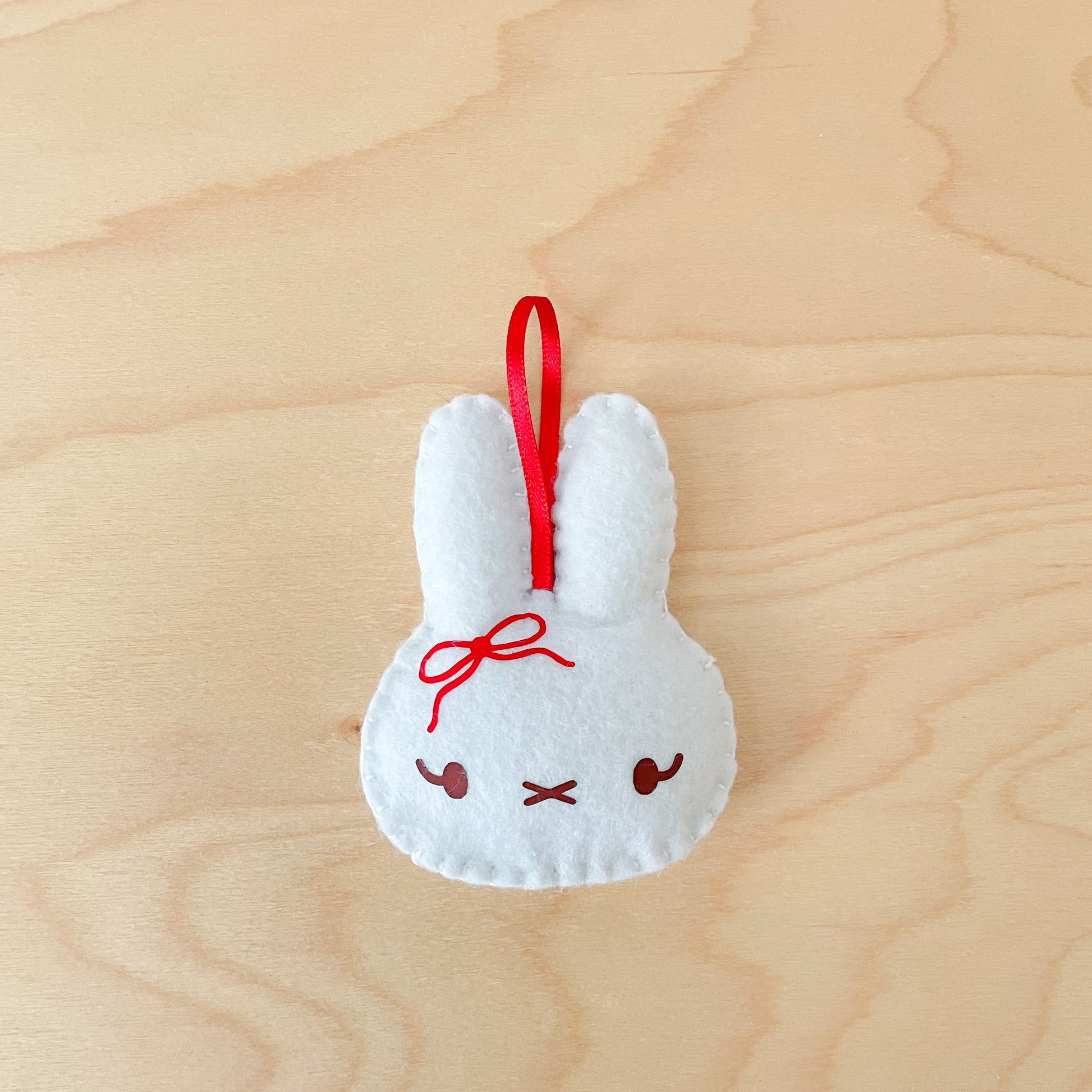 A charming Miffy inspired bunny felt ornament with a sweet red bow. This cute little hoppy friend adds nostalgic charm to any holiday display.