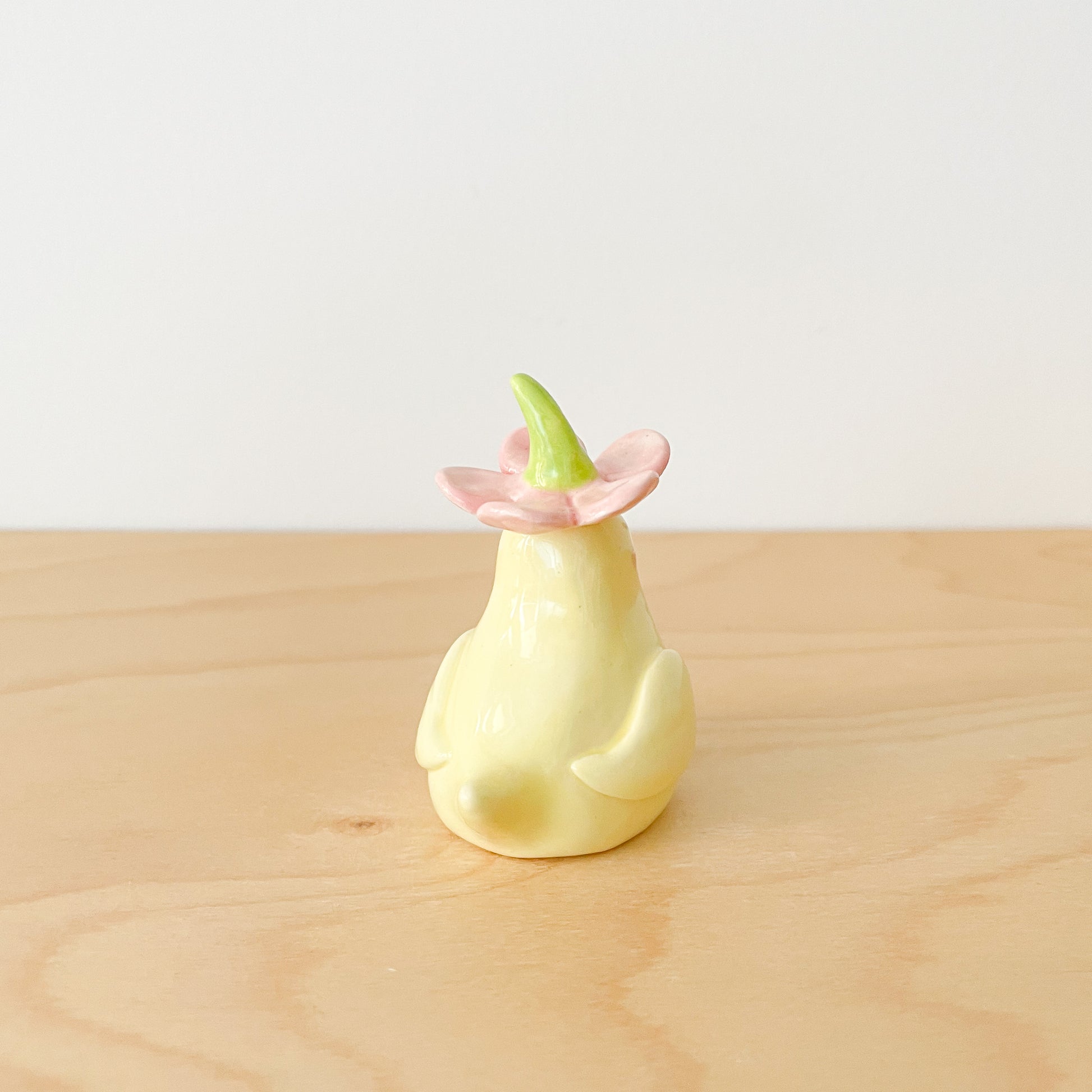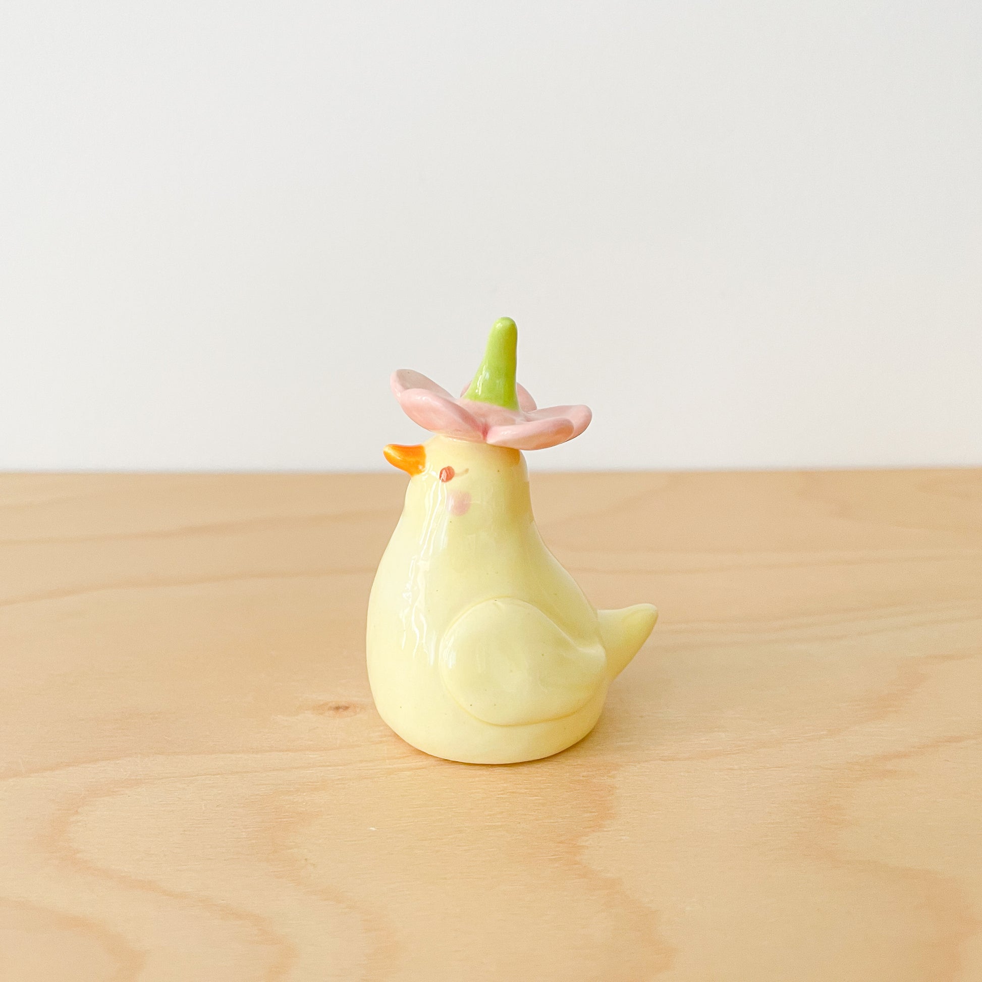 Cute yellow ducky with a pink flower hat that holds your rings. Perfect for your bedside table or desk!