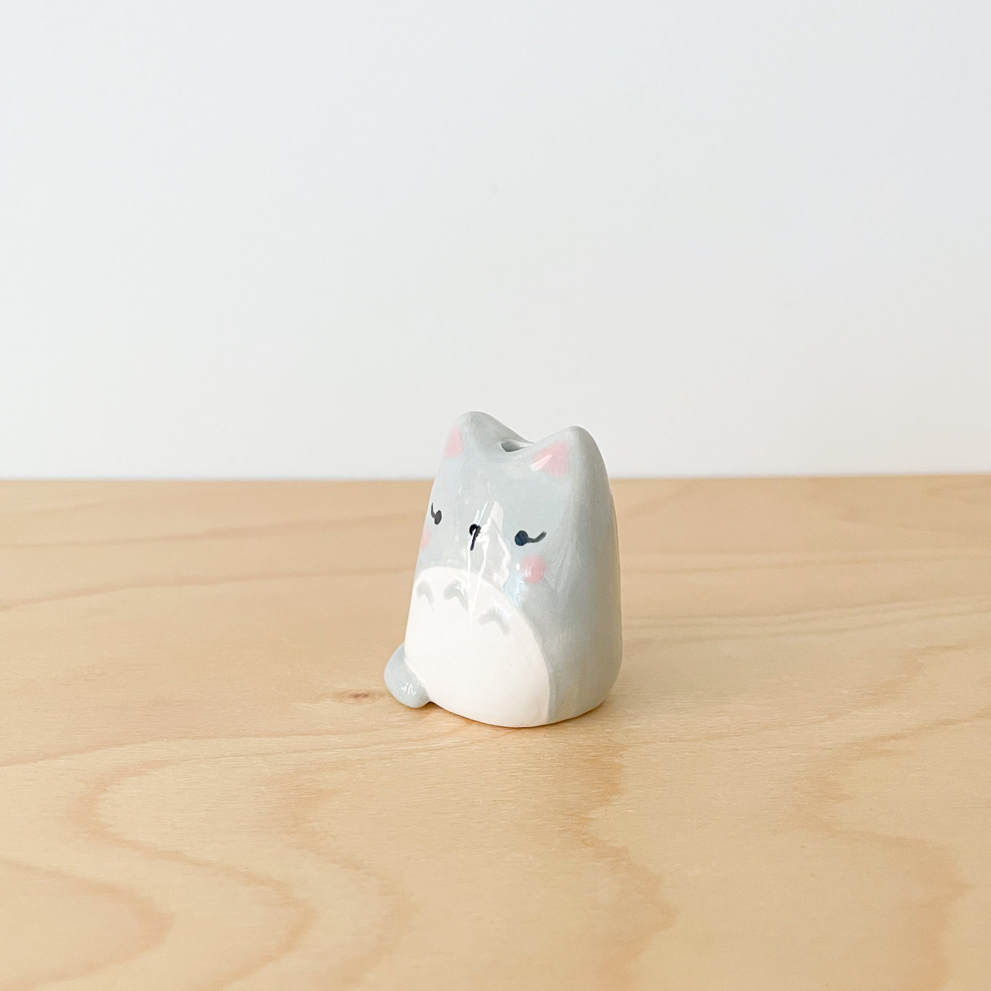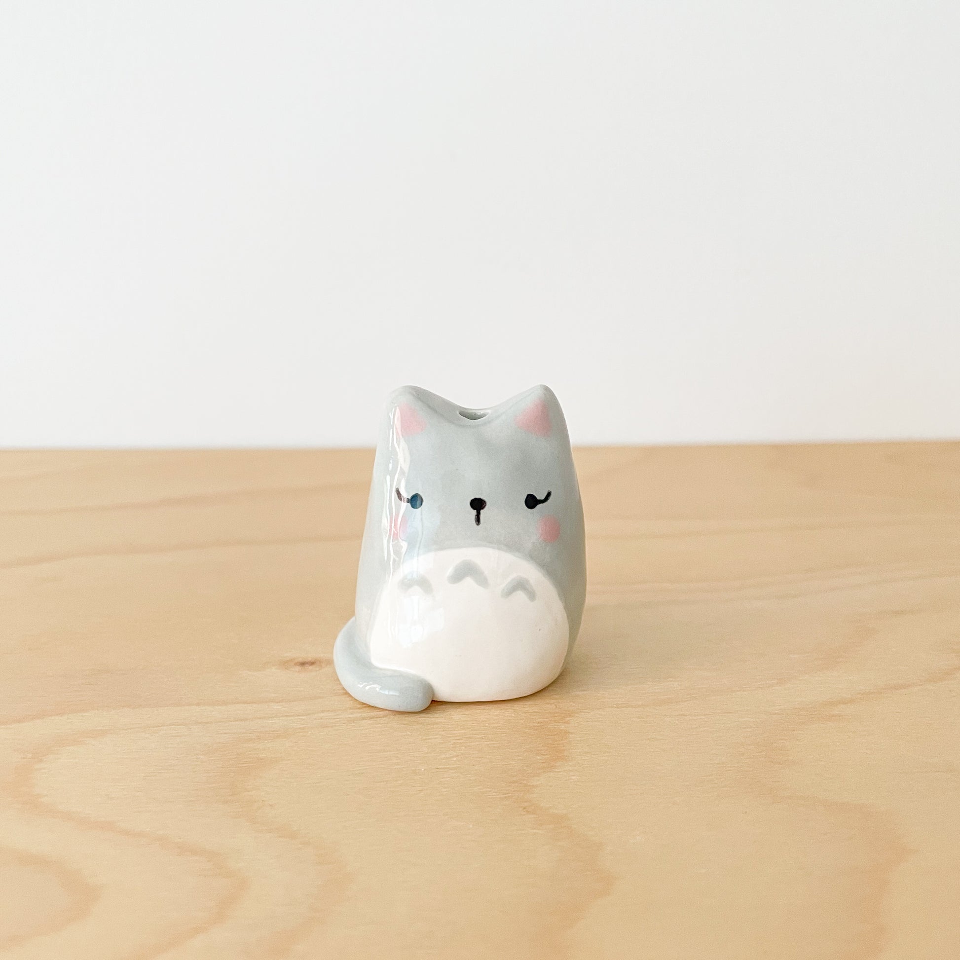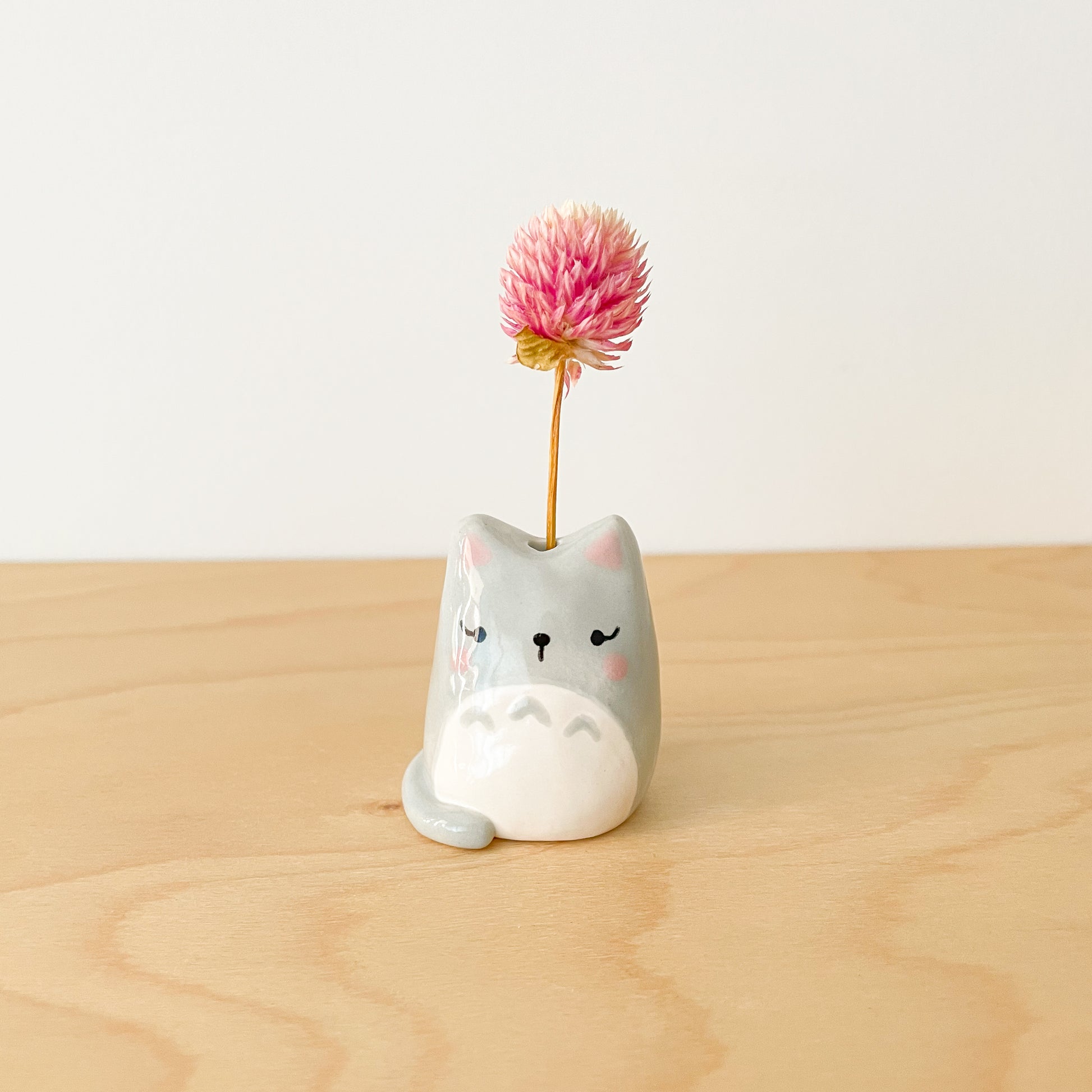 Add a touch of whimsy to your space with this Grey Totoro Cat Mini Vase. Perfectly sized for dried flowers, it brings a playful charm inspired by your favourite forest spirit.