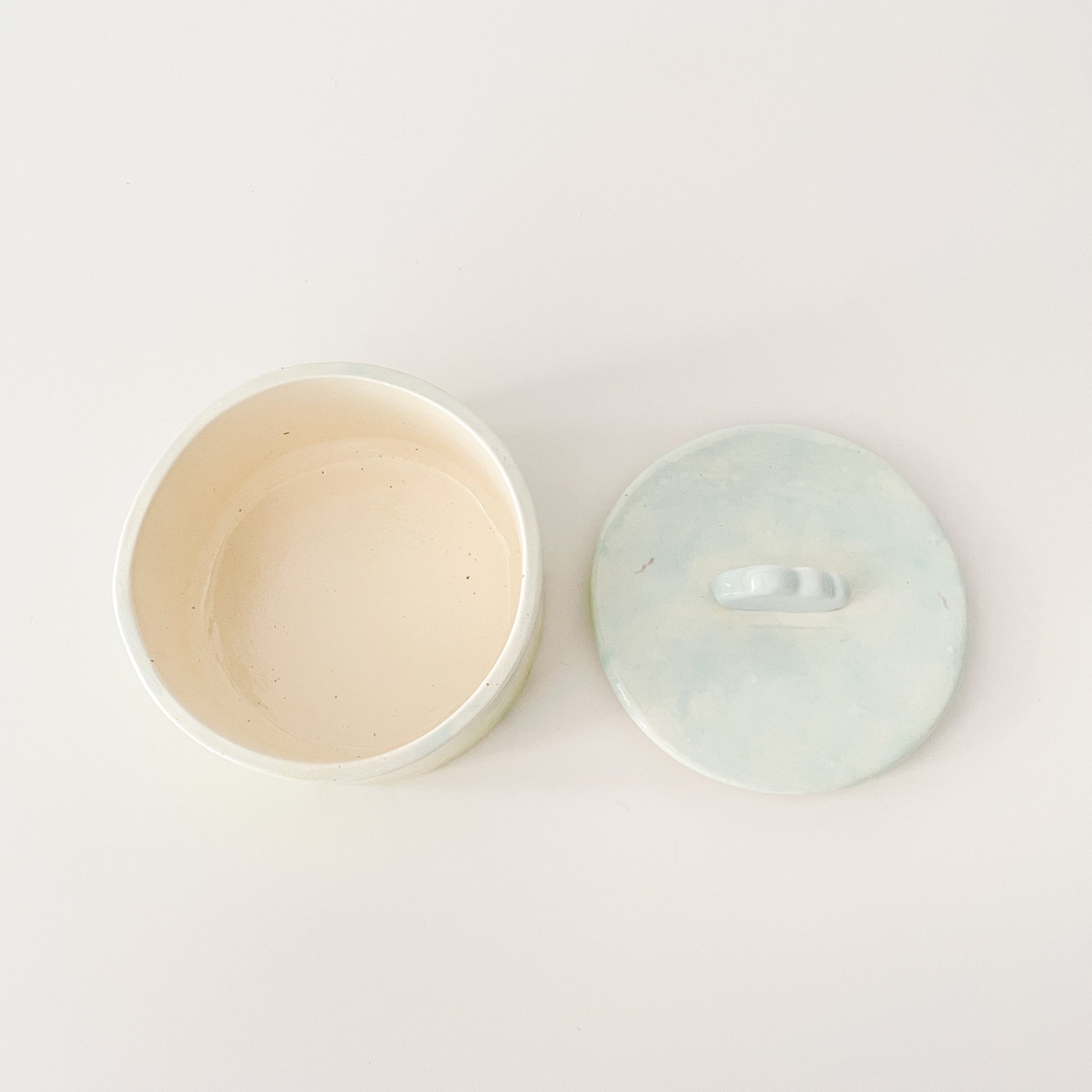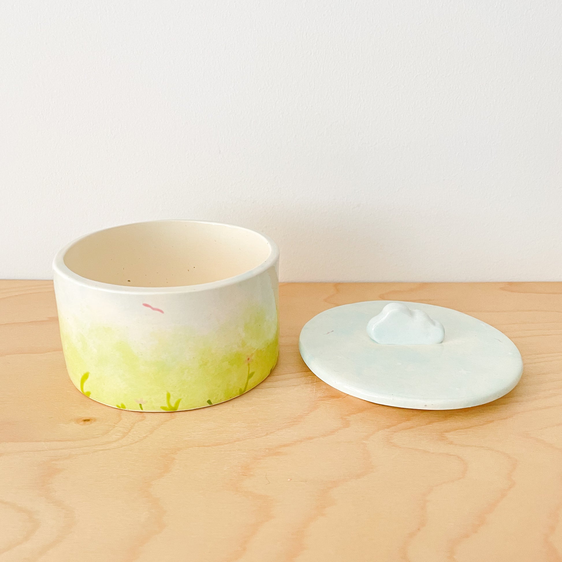 Bring a touch of whimsy to your space with the Dreamy Cloud Jar. Its delicate watercolor glaze captures a serene garden and sky scene, while a fluffy cloud sits charmingly atop the lid. Perfect for storing little treasures or brightening your room with a playful, dreamy vibe.
