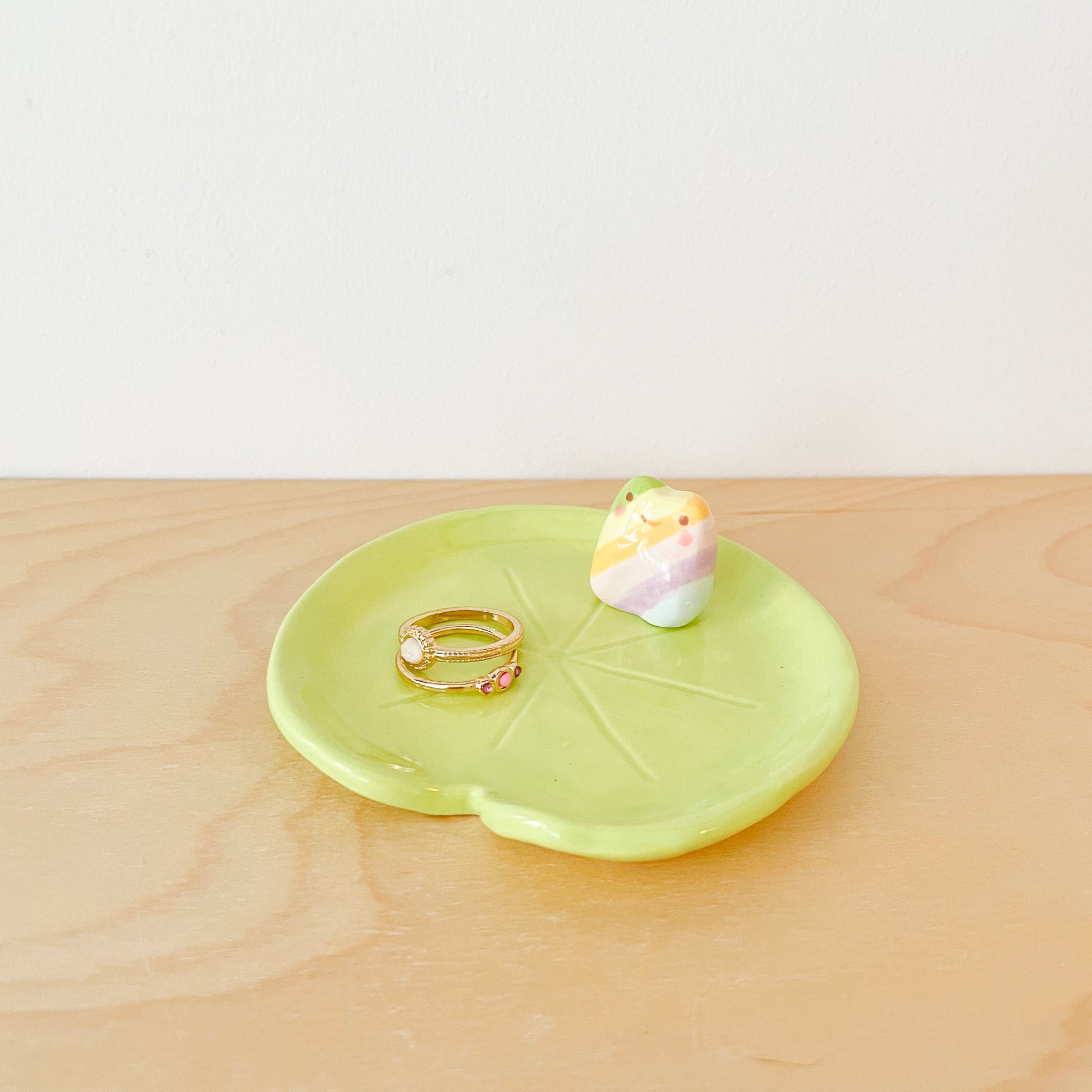 Add a splash of fun and quirkiness to your home decor with our Small Green Lily Pad Dish! This trinket dish, with its vibrant green lily pad design, is the perfect accessory for displaying your blind box frog collection.