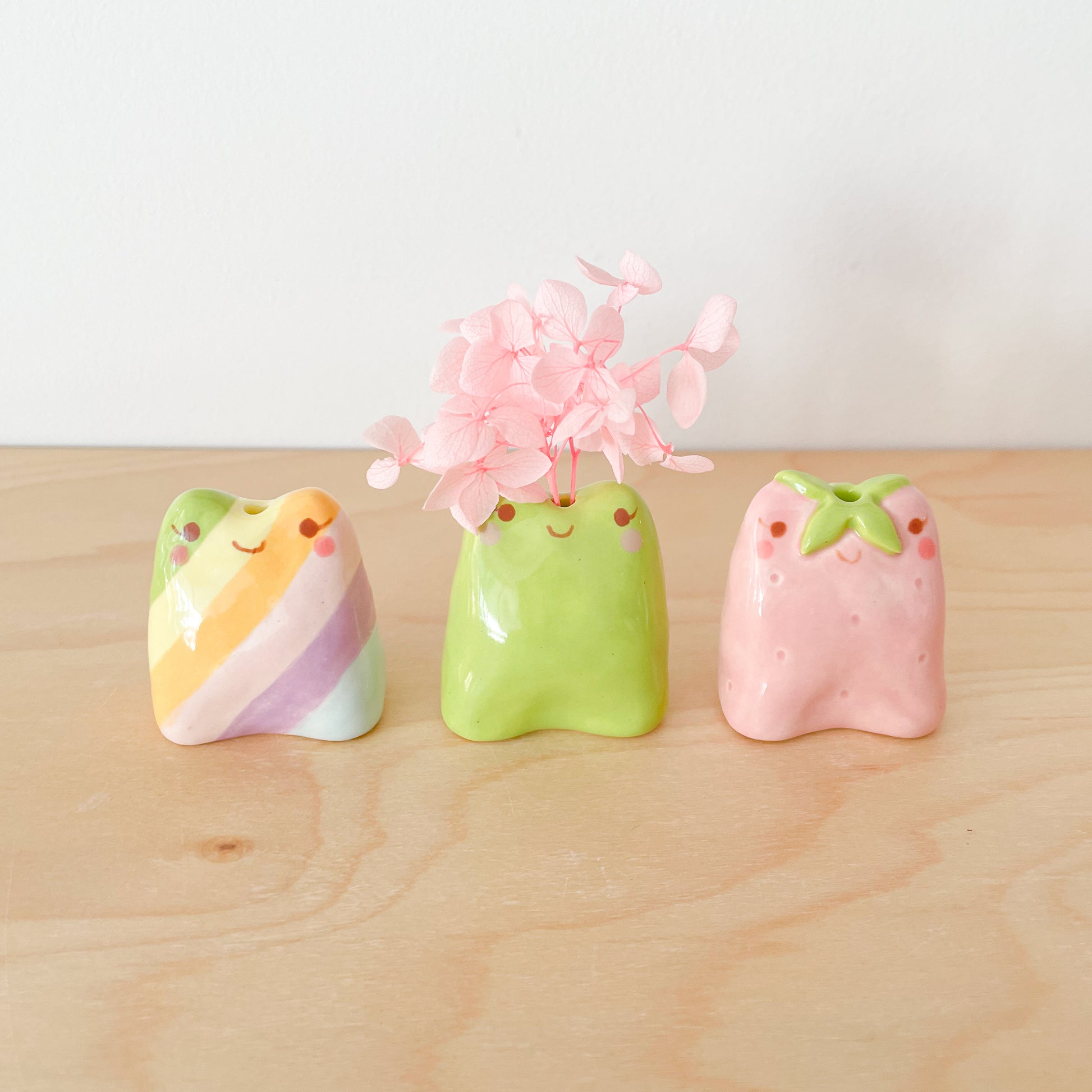 Add a hop of whimsy to your decor with this handcrafted frog mini vase, inspired by strawberries. Perfect for small bouquets or as a standalone conversation piece.