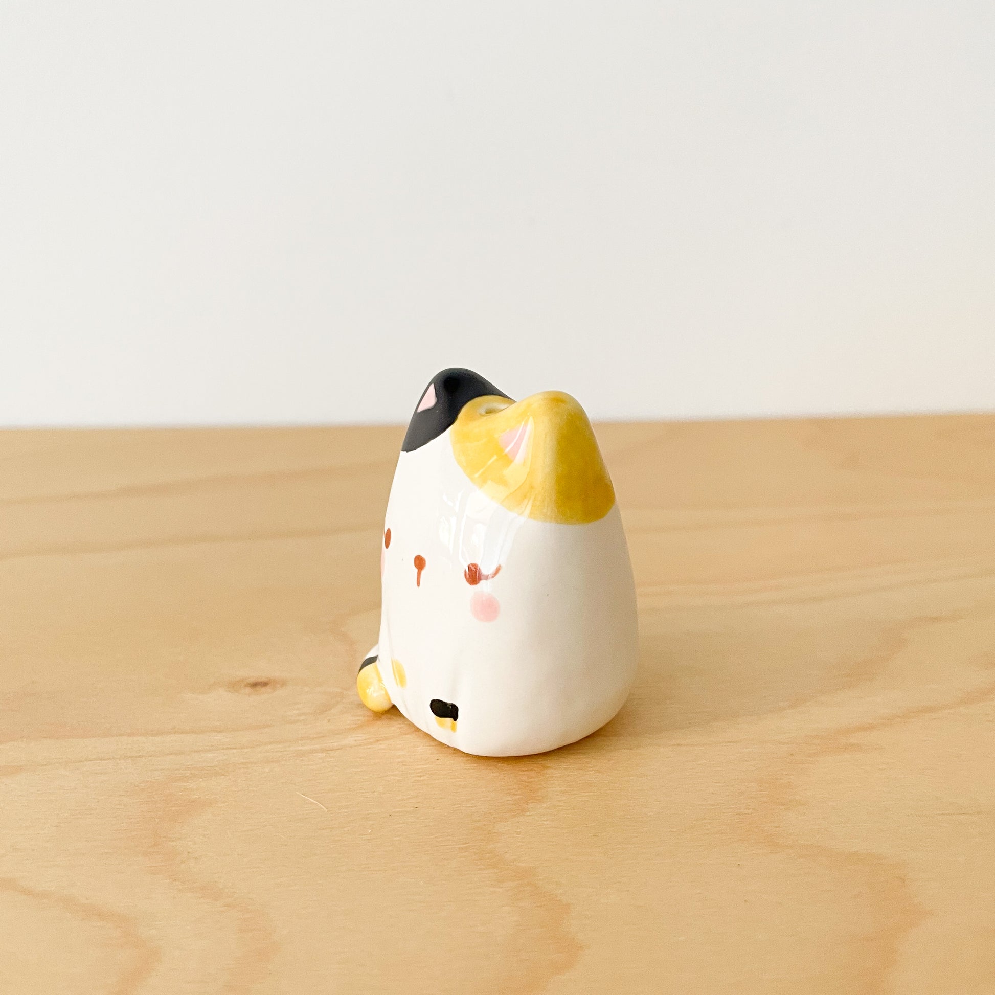 A vibrant calico cat mini vase perfect for whiskers, dried flowers, and tiny botanicals. This colourful feline friend adds playful charm to any space.