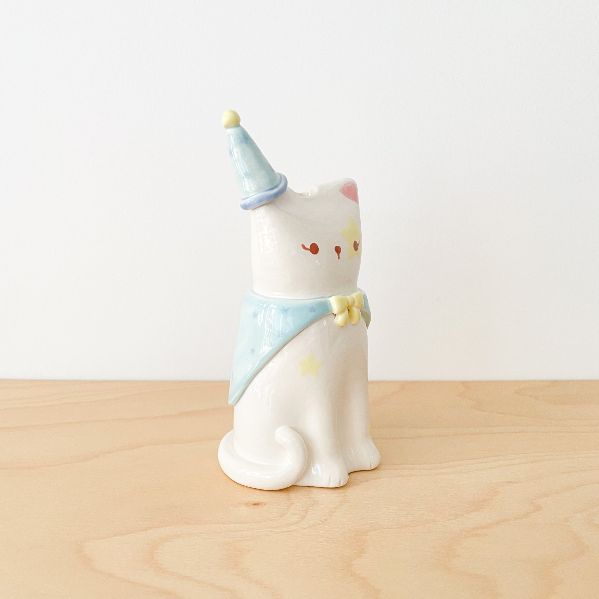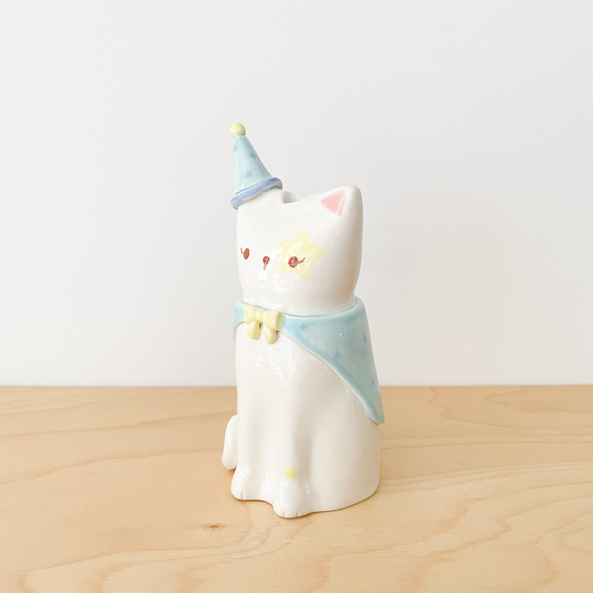A one of a kind wizard cat vase, hand sculpted and hand made with magical charm. Sporting a cute blue wizard hat and cape, this enchanted kitty is perfect for flowers or as a standalone decoration that brings spellbinding personality to your space.